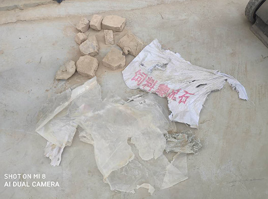 3.包裝袋不合格,這類情況一般是包裝使用的是二手大噸包,這類噸包有些有一定的爛口,為了不讓膨潤土粉末外漏,包裝工人有可能在爛口出放置塑料袋進(jìn)行補(bǔ)漏,如果補(bǔ)漏的塑料袋不進(jìn)行針線縫合固定,在使用膨潤土是,用來補(bǔ)漏的塑料袋就和膨潤土直接進(jìn)入了下料口,因此就出現(xiàn)了想象不到的雜質(zhì)。